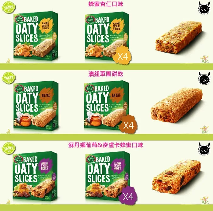紐澳軍團:全麥麥片、椰乾與黑糖烘培而成,是紐西蘭和澳洲的天然傳統餅乾口味蘇丹娜葡萄&麥蘆卡蜂蜜:全麥麥片結合蘇丹娜葡萄與麥蘆卡蜂蜜